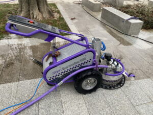 Echipamentele de hidrosablare proiectează un jet puternic de apă către suprafața pavajului.